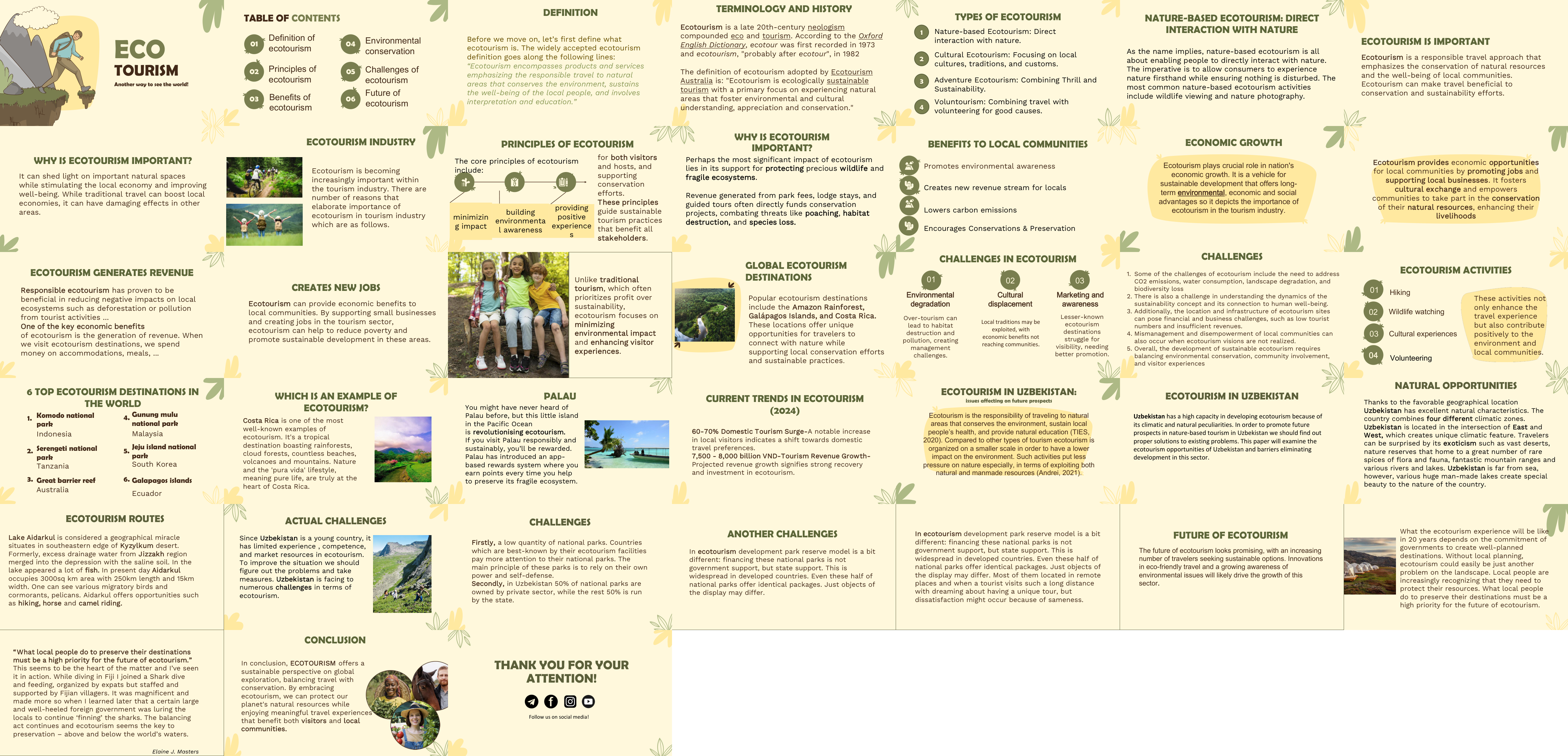 Ecotourism — bu nafaqat sayohat qilish usuli, balki tabiatni saqlash, mahalliy aholiga yordam berish va ekologik ongni rivojlantirish madaniyatidir. Ekoturizm orqali insoniyat o‘z sayohatidan nafaqat zavq oladi, balki sayyoramiz kelajagiga ijobiy ta’sir ko‘rsatadi.