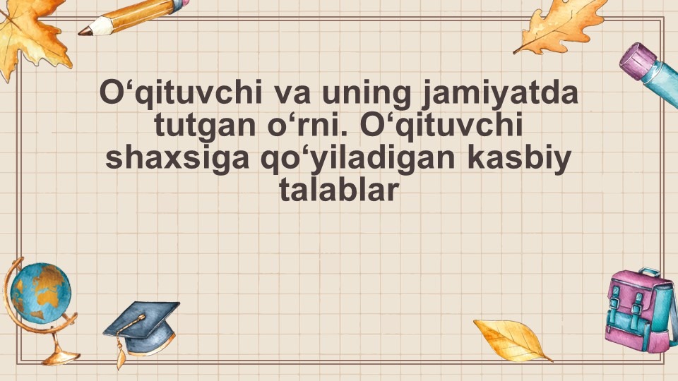 O‘qituvchi va uning jamiyatda tutgan o‘rni. O‘qituvchi shaxsiga qo‘yiladigan kasbiy talablar